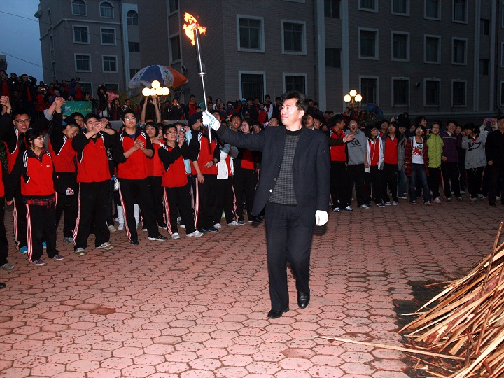6时半,再次由刘春普校长亲自手执火把,在同学们的热切注视下,激情点燃篝火。顷刻,篝火熊熊燃烧,焰火也五彩纷呈,霎时,欢声雷动,师生如潮。各班代表手拉手,环绕篝火尽情奔跑,释放着青春活力。