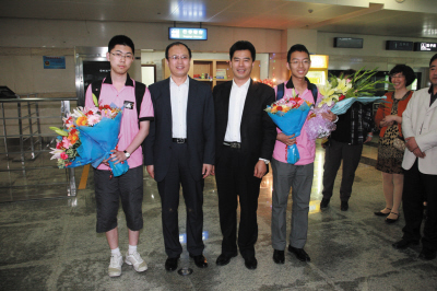 本报讯 昨天晚6时许,刚刚从印度新德里飞抵大连的大连育明高中高三学生王贺明和陈鑫,在机场受到了热烈的欢迎和特别的礼遇,市教育局相关领导在机场迎接他们,因为他们在刚刚结束的国际物理奥林匹克竞赛亚洲赛中双双获得金牌,为国家,也为大连争了光。