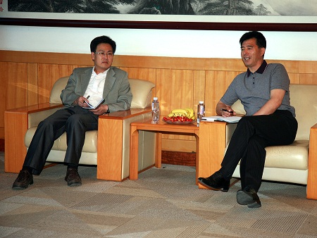 (刘春普校长正在向赵玉宝副局长做工作汇报)