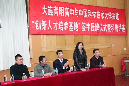 4月19日上午,中国科技大学招生办负责人和教授一行5人来到我校,与我校一起举行了大连育明高中与中国科技大学共建“创新人才培养基地”签字授牌仪式暨科普讲座。