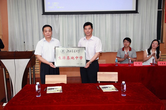 随后,刘军副校长与刘春普校长分别代表各自学校签署了“生源基地学校”的共建协议。刘军副校长代表学校正式向育明高中授予了“北京交通大学生源基地学校”的牌匾。