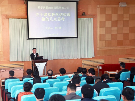 教学副校长化学特级教师曹子谦做了“课堂教学结构调整”讲座,讲座核心在于落实基于问题的高效课堂的基本切入点,要变革教师和学生课堂行为,编写导学案及有效使用,适当调整课堂教学结构。