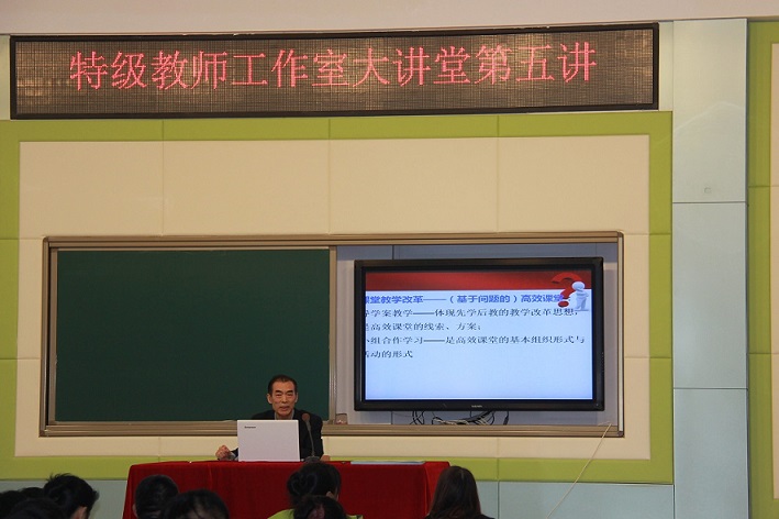 | 5月11日,我校特级教师工作室第五讲在五楼阶梯教室开讲,科研室主任、语文特级教师刘晓宁做了“小组合作的依托——导学案”的精彩讲座,工作室成员、学员以及高一教师80余人聆听了讲座。