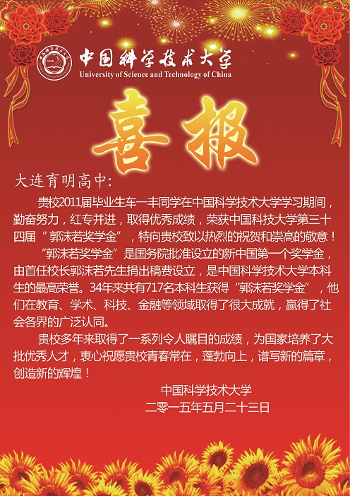 | 大连育明高中2011届毕业生车一丰同学在中国科学技术大学学习期间,勤奋努力,红专并进,取得了优秀成绩,荣获中国科技大学第34届“郭沫若奖学金”,并以全额奖学金考入麻省理工学院攻读博士,成为育明高中杰出毕业生的优秀代表。5月23日,中科大隆重举行了颁奖典礼,育明高中副校长曹子谦、校长助理孙颖应邀参加,共同见证这一激动人心的时刻!