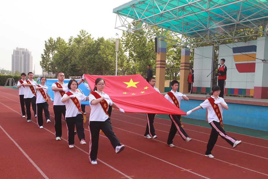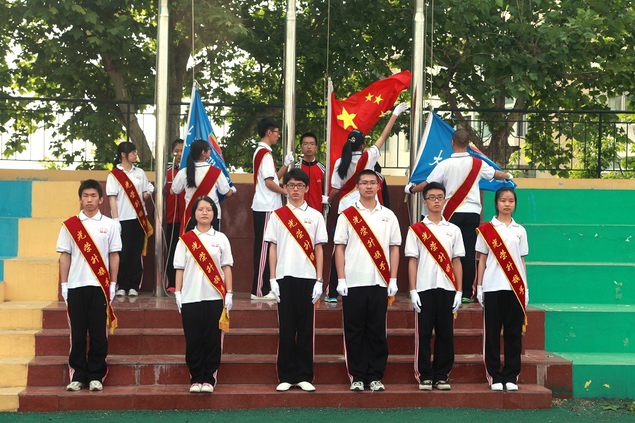 升旗仪式由原团委文体部部长张荣臻同学主持。十二名来自各班级的优秀毕业生担任了护旗手,护卫在高耸的旗杆下,挺拔而庄重。国歌奏响,全校师生齐声高唱,五星红旗冉冉升起,也升起了每一位毕业生的民族、理想与荣誉,唤起了每一位毕业生青春的使命与中国梦。国旗在师生的注目礼中升上顶端,每一位师生都仿佛感受到了这次仪式的神圣而丰富的内涵,心中涌起了新的责任与使命。
