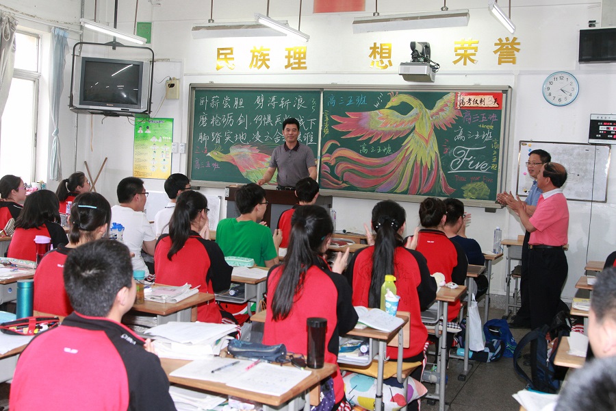 刘春普校长每进入一个班级,都在同学们热情的掌声中即兴讲话。他的讲话充满力量和激情,使高三学子热血沸腾,甚至流下了激动的泪水。他在演讲中,表扬了高三年级师生三年来付出的巨大努力,肯定了这届毕业生的突出的实力,从战略战术的角度向考生提出了几点建议,并从心理学的角度做了认真的提醒。本届高三班主任各个实力强,有绝活,教育教学方法独到,从省科研骨干于欣老师、全国优秀教师孙久志老师、世界金牌教练杰出青年王青林老师、最美教师程玉玲老师、智慧幽默张玉宝老师、省骨干常爱华老师、慈父许维忠老师、状元班主任白亚光老师、严谨豁达姜明珠老师、全国劳模慕德兰老师、十佳文学教师曹秀丽老师到特级教师于焱老师,三年的教导让学子们真正长大,能够从容淡定地迎接高考。刘校长鼓励同学们沉稳自信地迎接高考,以平常心对待高考,希望同学们坚定意志,明确目标,超越自我,创造辉煌。