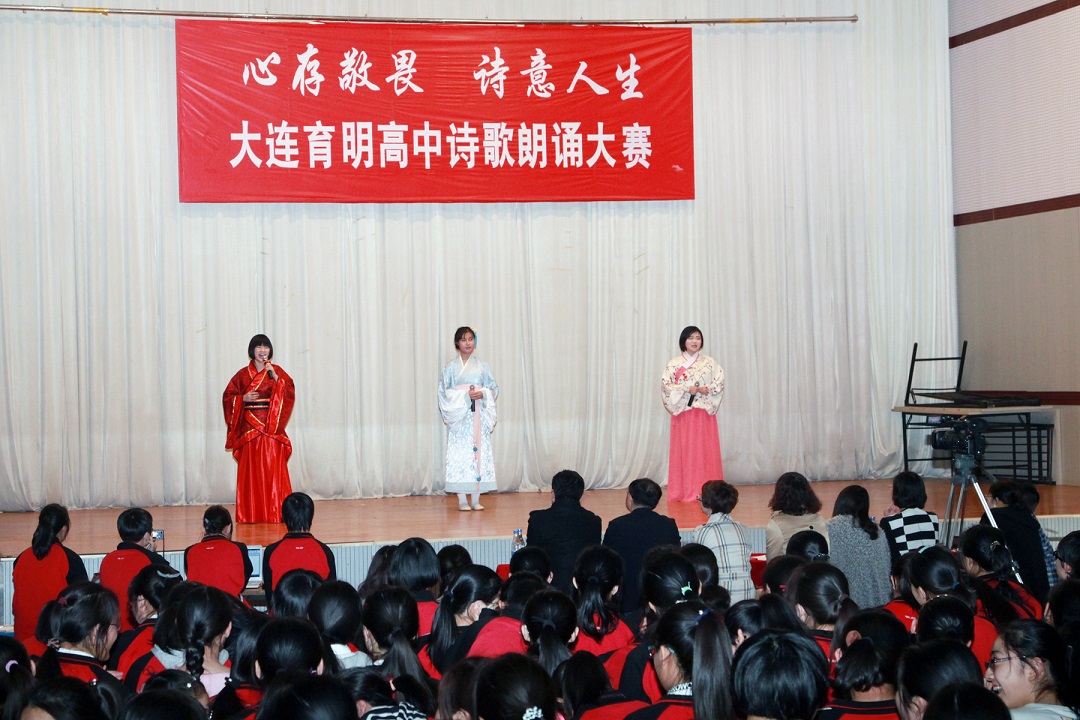 四月伊始,春意盎然。阳光正艳,春暖花开。为丰富我校校园文化生活,由大连育明高中学生会学习生活部承办的高一“心怀敬畏,诗意人生”主题诗朗诵比赛于2016年4月8日举行。本次比赛特别邀请了辽宁师范大学中文系薛猛教授、育明高中团委书记和高二语文备课组作为评委。高一12个班级参与了本次比赛。