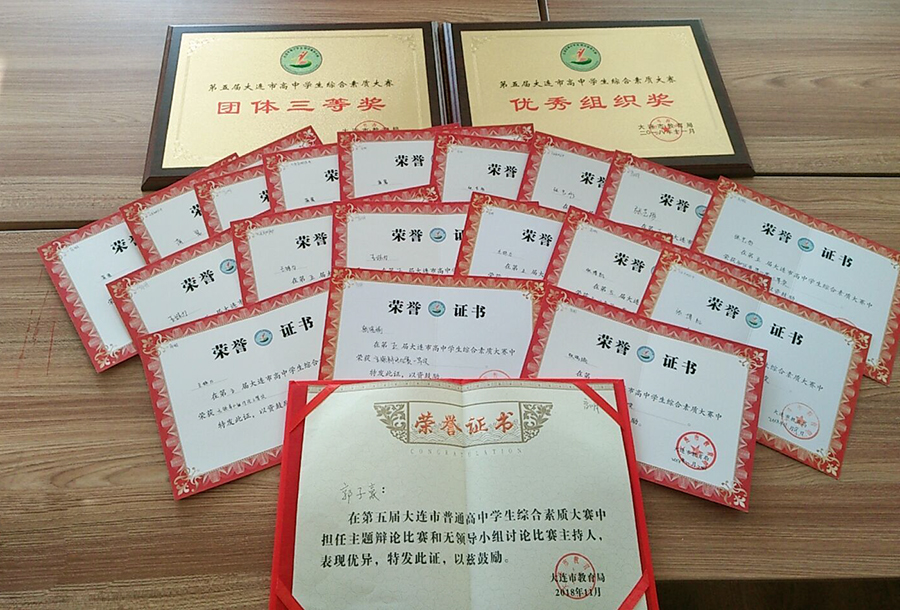近日,由大连市教育局主办的“第五届大连市高中学生综合素质大赛”落下帷幕。我校参赛选手在五项比赛中表现优异,再创佳绩。本届大赛共有32支代表队(含北三市)150余名选手参赛,每个学校有五名学生组成代表队,每名同学只能参加4个项目的比赛,比赛项目包括知识竞答、无领导小组讨论、英文演讲、才艺展示和主题辩论五个分项。通过比赛综合各分项的成绩,确定选手综合素质成绩和团体成绩。