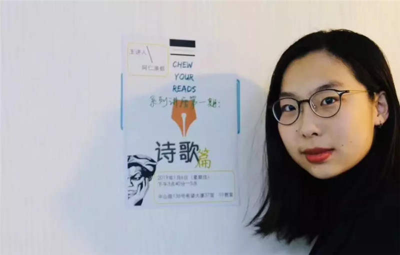 阿仁澳都同学深深热爱诗歌,她也有一颗热忱的心,为了向人们传达“诗歌是丰盈充实人心灵的精神养料”的理念,她创办了自己的诗歌欣赏公众号和喜马拉雅电台直播个人频道,不但推荐英文名诗,也介绍自己英汉汉英翻译的诗歌。此外,她还自己一手策划举办了系列英语文学阅读讲座,传递“咬文嚼字,精细阅读”的学习理念和学习方法。