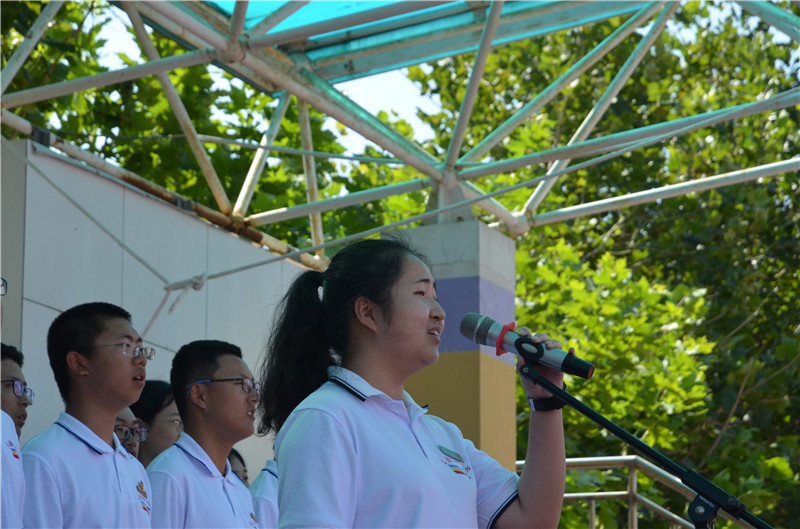 为了抒发全校师生的爱国情怀,本升旗仪式增加了新的环节——我校庆祝建国七十周年合唱比赛中获得一等奖的高一一班和高一十一班登上主席台,在学生会文艺部长张艺彤领唱下,引领全校齐唱《歌唱祖国》,嘹亮动人的歌声把升旗仪式推向高潮,为本次精彩的升旗仪式画上一个圆满的句号。