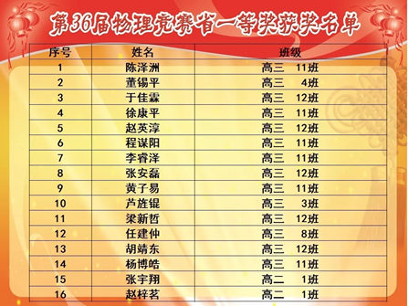 | 在刚刚结束的第36届全国中学生物理竞赛复赛中,我校物理竞赛学生在杨国老师的带领下再创佳绩,6人进入辽宁省代表队,16人荣获省一等奖;我校进入省队人数占辽宁省代表队总人数近一半(辽宁省代表队 14人),以绝对优势领跑全省,他们分别是陈泽洲,董锡平,于佳霖,徐康平,赵英淳,程谋阳同学,其中陈泽洲同学以总分265分夺得辽宁省总分第一名。