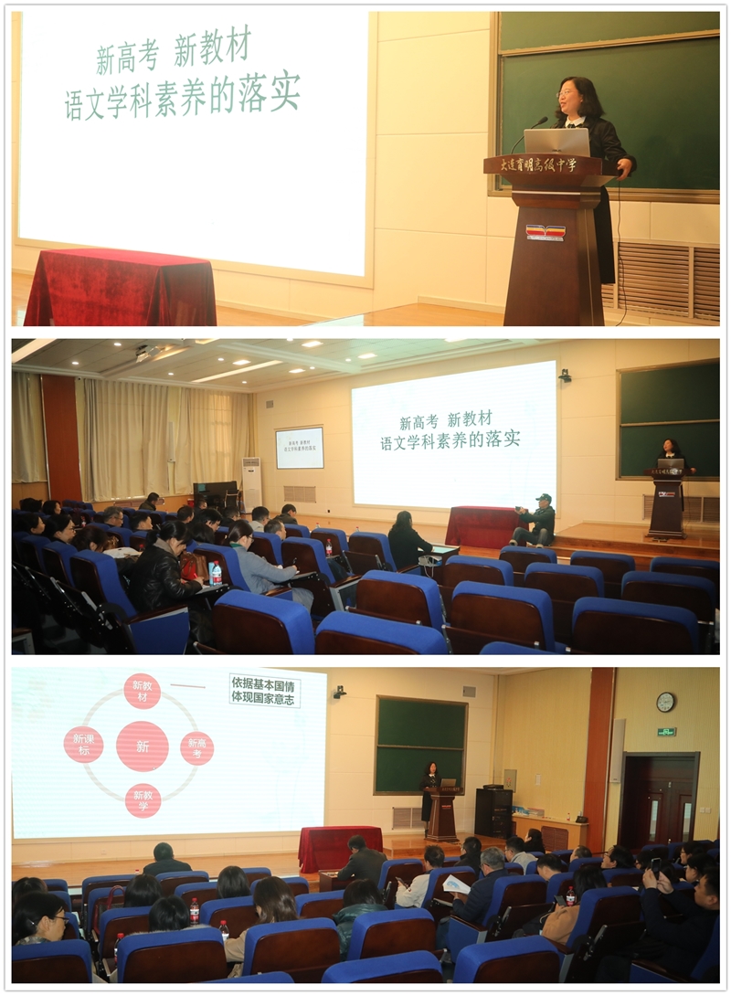 参观完校园,我校优秀教师代表郭方彦老师在四楼阶梯教室,为考察团成员做了关于新教材使用中如何落实语文学科核心素养的专题报告。郭老师以新高考、新教材、新课标、新教学为切入点,点明新高考的命题方向——坚持一核四层四翼:重视基础,突显应用,创设情境,鼓励创新,价值引领,素养导向,能力为重,知识为基。我省作为首批使用部编版新教材的省份,语文教学求新求变,我们重任在肩,郭老师为大家介绍了新教材的结构和体例,并结合具体的教学案例,分享了我校目前对新教材的使用探索,详细讲解了单篇课文如何教、群文阅读如何做、主题阅读如何拓展、整本书阅读如何开展,为语文核心素养的落实提供了可操作的借鉴。讲座思路清晰,案例典型,生动形象,情理兼备,展现了育明高中语文教师丰厚的底蕴和素养。现场气氛热烈,来访成员们表示受益匪浅,对杭州四中下学期新教材的使用有很大的帮助与启发。