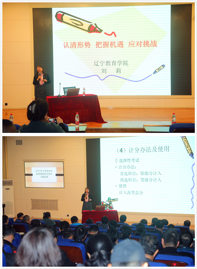 随后,辽宁省教育学院高中部刘莉主任为参会校长们做了有关辽宁新高考改革与实施的专题讲座。刘主任对实施新一轮高考招生制度改革的意义与《辽宁省深化考试招生制度改革实施方案》进行了详细解读。为大家明确了改革的主要任务,改革考试形式和考试内容,健全和完善高中综合素质评价机制,改革招生录取机制;就《辽宁省普通高中学业水平考试实施办法》,从为什么考、考什么、怎么考、何时考、报考要求、成绩呈现与使用多方面给予指导;对辽宁省普通高中新课程的实施与新高考相融合应怎样进行对应准备给了大量的案例和建设性的意见,还对辽宁省综合素质评价实施办法及应用做了解读。提出面对新课标、新高考的我们要认清形势,把握机遇,积极挑战。
