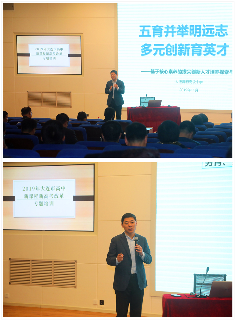 下午,大连教育学院高中中心张士国主任作了题为“新一轮高考命题改革与备考应对”专题讲座,张主任对新高考进行深入剖析,讲解细致入微,引人入胜,给在座的校长带来新启发。随后,开发区第八中学吕校长与大家进行了选课走班经验交流,直观地阐述了在新高考改革背景下,学校最关心也最具操作性的科学走班问题:如何组织选课科目的教学,让学生的选择尽可能得到满足,让学生拥有个性化的课表;对教学班与行政班如何进行管理考核评价。我校李振权校长结合我校具体实际,作了题为“基于核心素养的创新型人才培养探索与实践”专题讲座,围绕拔尖创新人才培养的探索背景、探索实践和探索成果进行了深入的介绍,解决了“拔尖创新人才培养什么?用什么培养?怎样培养?”的问题,演绎了我校“学科专长教育拔尖创新人才培养”的办学特色,诠释了育明拔尖创新人才的基本架构和实施经验。
