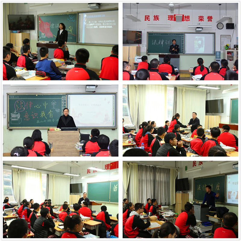 我校非常重视宪法等法律宣传工作,把法律讲座纳入到学校的校本课程中,组建了校内老师和校外兼职辅导员组成的法治课程师资团队,每个学期定期开展授课,受到学生和家长的欢迎。同学们通过法治课程的学习,培养了高中生的法治信仰,更加坚定了新时代中国特色社会主义的道路自信、理论自信、制度自信、文化自信,为肩负起中华民族伟大复兴的光荣使命,为培养德智体美劳全面发展的社会主义建设者和接班人凝聚磅礴力量。