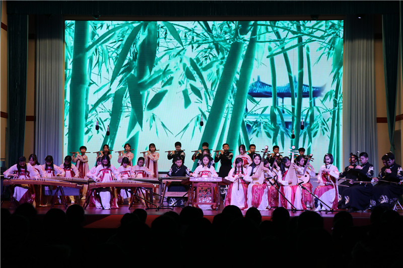 在民乐社的合奏《春节序曲》中,音乐会正式启幕。弦乐声声,盛世太平。吉祥悦耳的旋律渲染了场内热烈欢腾的气氛。一曲完毕后,悠扬婉转的《长安十二时辰幻想曲》把观众拉入了另一种境界。本曲由大连爱乐乐团原琵琶首席暴晶莹老师指导“谁道舞姿窈窕,折旋笑得君王。”琴瑟和鸣,古韵流淌,同学们听得如痴如醉,仿佛回到了那个古老而雍容的时代。