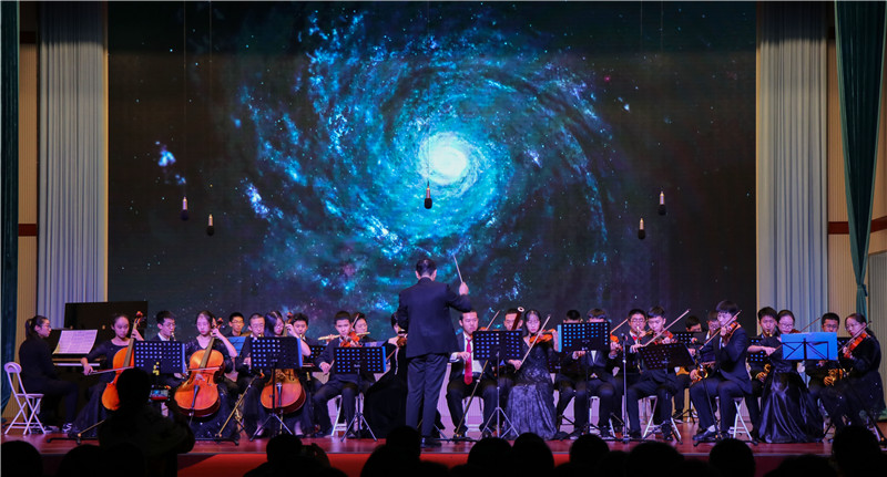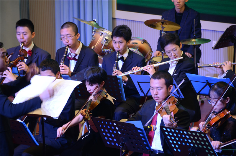 管弦乐团压轴出场,乐团由大连大学音乐学院王立鹏老师指挥,为大家带来了五首风格迥异的中外经典佳作:有气势磅礴、声韵浩荡的《回到未来》,有民族气息浓郁的《茉莉花》,也有来自电影同名主题曲、悠扬的《天空之城》;也有节奏欢快的《康康舞曲》;有激励一代中华儿女,回荡在每个中国人心中的《我和我的祖国》,这五首乐曲展示了从古典到现代,从浑厚到轻快,从中华到西方的几种音乐风格,引人入胜,余音绕梁。随着全场共同哼唱起那首耳熟能详《我和我的祖国》,本场音乐会缓缓降下帷幕。