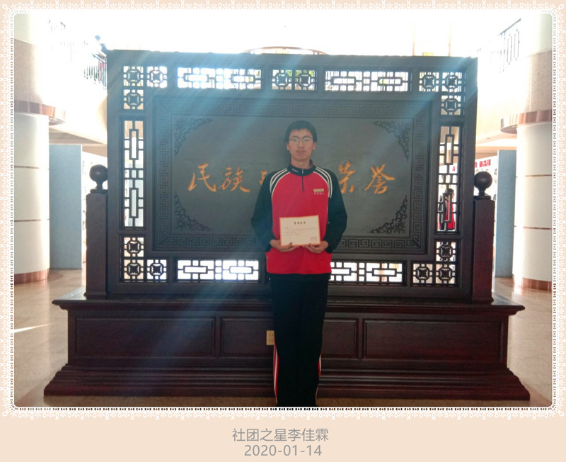 李佳霖同学是第五届社团联合会主席。平日里他工作认真负责,学习刻苦,品德优秀,以严谨的工作作风,积极乐观的处事态度,以及拼搏进取的学习精神在同学中起到了良好的模范带头作用,赢得了老师及同学们的一致好评。他曾被评选为市级优秀学生干部。在他任职期间,参与并策划了校元旦联欢会等大型活动,为社联的制度化建设出谋划策,制定社团楼管理条例,程序化社团活动申报流程,加大社团楼的管理力度,让学校放心,学生安心。他还参与了公益性社会实践,组织社团进行义卖,为患有自闭症的儿童募集善款总计6000元。