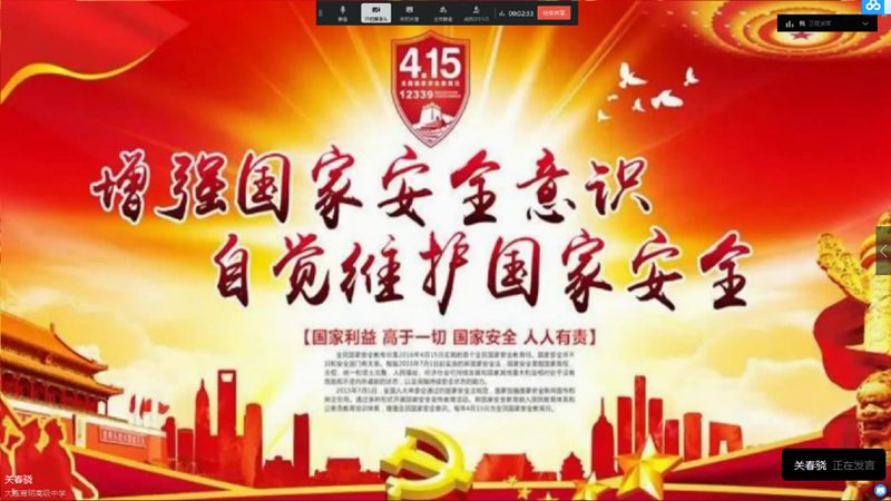 为集中传播国家安全方面的知识,增强国家安全法普法宣传的效果,同时增强青年团员的国家安全的意识,切实履行维护国家安全的法律义务,大连育明高级中学校团委于4月15日中午召开线上国家安全教育会议。本次会议由团委副书记关春骁老师主讲,以国家安全为核心,向校团委成员强调“国家利益高于一切,国家安全人人有责”。