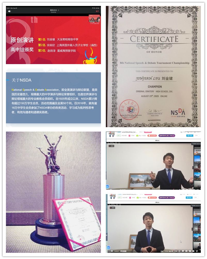 | 2020年8月24日,由NSDA中国组委会主办的OriginalOratory (英文原创演讲) 线上赛落下帷幕。我校三年三班刘金健同学,在此次线上全国总决赛中荣获全国总冠军。该比赛的参与者大部分来自北京,上海的国际学校,以及加拿大,英国,美国等海外高中,竞争十分激烈。本次全国总决赛共有来自全国41个赛区,以及海外的百余名选手入围全国总决赛。