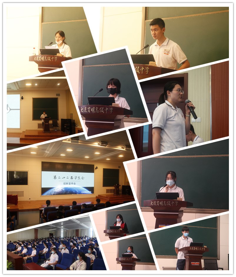 2020年9月8日中午十二点,大连育明高级中学于四楼阶梯教室举办22届学生会招新大会,学生会各个部门将通过这个机会注入更多新鲜血液。学校希望高一同学可以加入到适合他们的部门中,在工作中锻炼自己,迎接接下来的学习生活。高三各部门部长依次介绍各部门的工作内容及招新要求,高一同学积极响应。大会由二年二班阎泓羽同学主持。