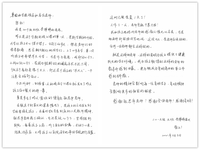 2021年3月4日上午,我校高二(9)班李博瑞家长来到学校,强烈希望见到我校张忠华老师和学校领导,并带来一封感谢信和一面锦旗。德育处董玉国主任接待了他。在交流中得知,3月2日晚李博瑞同学在宿舍因手术后刀口开裂,张忠华老师带其到医院缝合至凌晨,家长特此来校表示衷心的感谢。