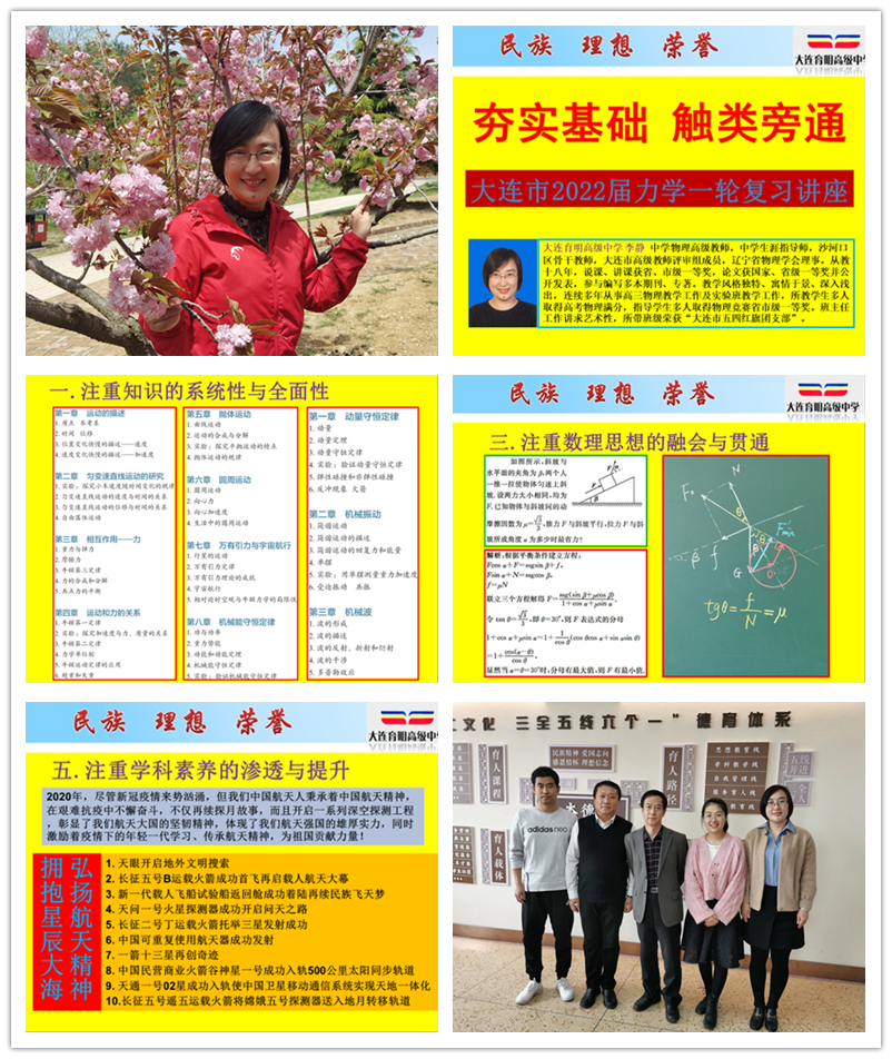 灼灼夏日,朗朗乾坤。于2021届高三考生毕业之际,于2022届准高三考生蓄势待发之时,大连育明高级中学高二物理备课组承办了大连市本届首次一轮复习教研活动。由育明高中高二五班班主任、强基一班任课教师李静老师为大连市物理同仁带来题目为《夯实基础触类旁通》的力学一轮复习讲座,拉开了大连市新一届高三物理复习备考的大幕。