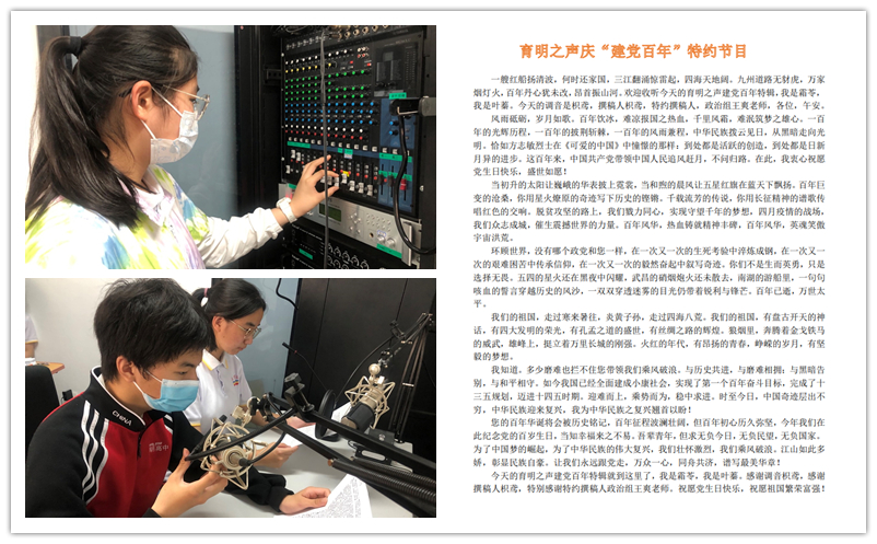 7月1日中午,在共产党百年华诞的伟大时刻,“育明之声”策划了庆“建党百年”特别节目,用青春力量传播党的声音,讲好党的故事,弘扬社会主义正能量。