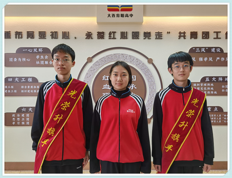 旗手王熙荣:王熙荣同学是高三五班的生活委员兼物理课代表。他学习成绩优异,认真踏实,待人温良,乐于助人,有根植于内心的修养与善良。运动会上,他为班级赢得多项荣誉;在班级生活中,他尊敬师长,严于律己,以身作则,组织引领同学完成值周等劳动任务。德智体美劳全面发展的他,被评为大连市三好学生。相信他在未来一定会执着于理想,纯粹于当下。