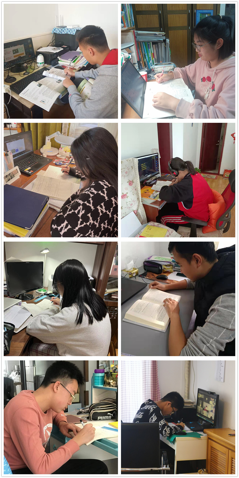 在这个特殊的时刻,即使我们不能相见,但心灵之桥仍把我们相连。同学们克服设备问题,网络问题等重重困难,每日按时早读,小考,上课,自习,互相督促,互相学习,克服“畏难情绪”,为了心中的梦想一点点前行。新冠疫情,隔离的只是外在,我们的内心确是紧紧团结在一起,让我们共同进步,勇攀高峰!