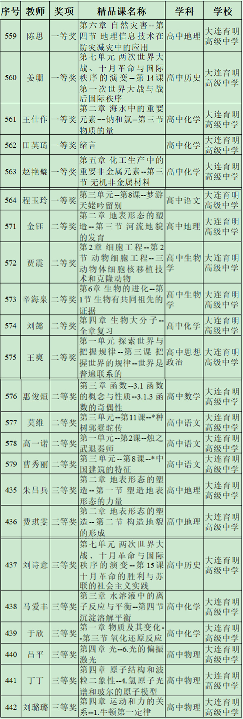 | 2021年11月13日,辽宁省教育厅发布《关于对2021年辽宁省“基础教育精品课”省级遴选推荐情况进行公示的公告》,大连育明高级中学成绩斐然。全校共有23节精品课获得省级奖项,获奖数量位居全市第一,其中一等奖6节、二等奖9节、三等奖8节,并且语文组程玉玲老师、化学组田英琦老师、历史组姜珊老师、地理组陈思老师的精品课被推荐参评部级精品课。同时,大连育明高级中学获评辽宁省2021年“基础教育精品课”优秀组织学校。