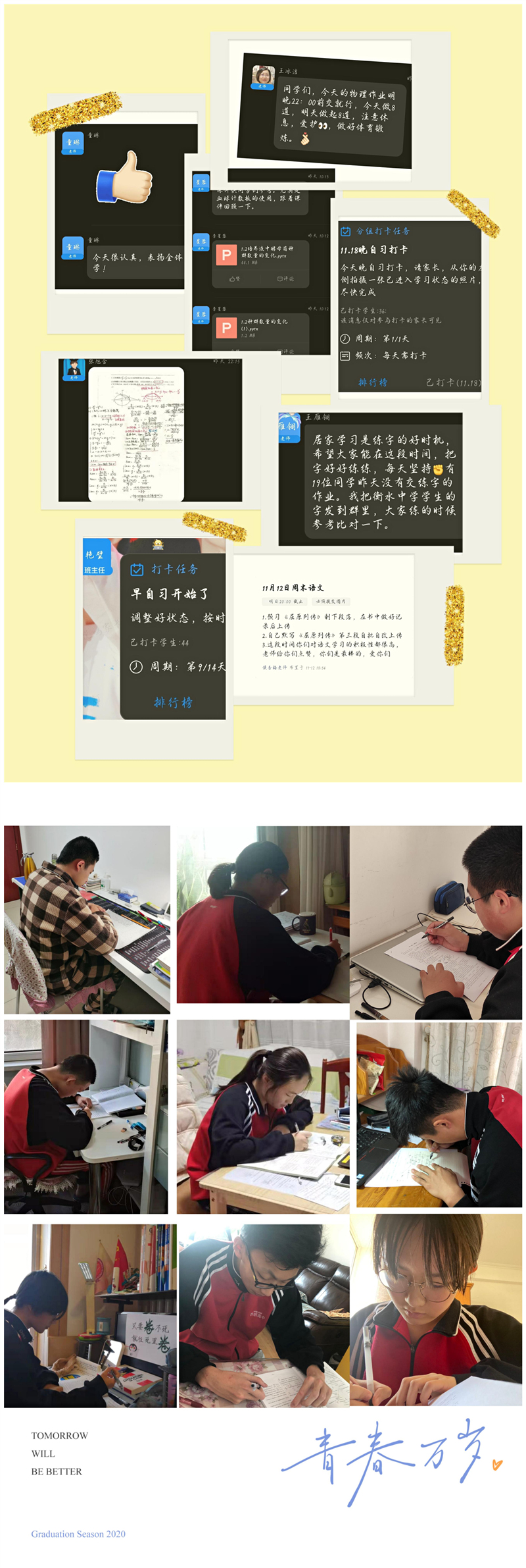 班主任赵艳璧老师带领高二八班全班同学与各科老师于11月7日进行网课调试,并于11月8日早晨进行全体动员,要求同学在家做好安全防护的同时努力学习,切勿放松,并做好期中考试的准备。老师们温暖的话语和贴心的提醒也让文字和知识点有了温度,让远隔各处的我们心聚在一起。