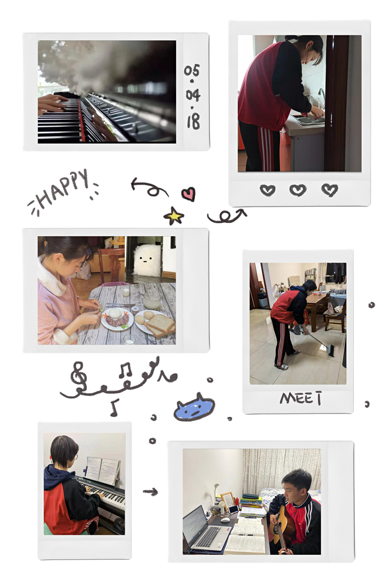 课余时,我们通过音乐、家务等方式丰富生活,或弹琴、或练习厨艺、或做家务,课余活动的多彩,让同学们有更好的心情与更充沛的精力迎接下一个学习的挑战。