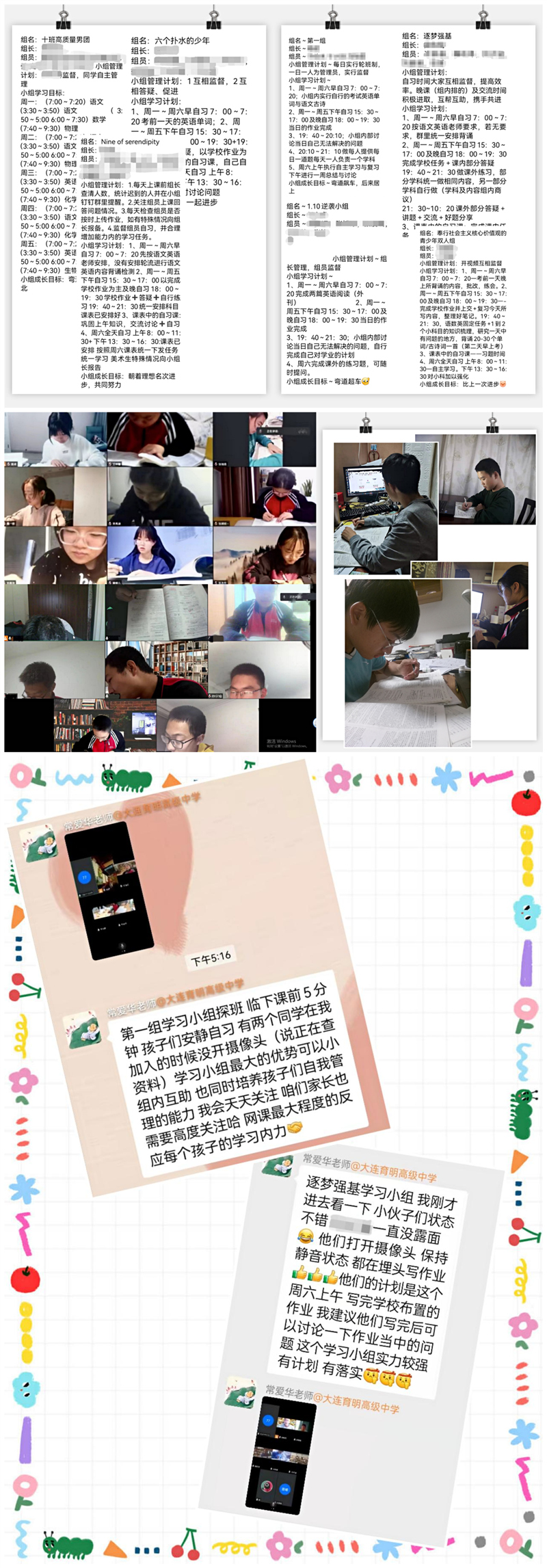 网课是对自律性最大的挑战! 只有自律、自主才能走的更远!常老师在网课伊始就利用班会和家长会跟全体同学明确的指出了这一点。十班同学快速集结,班级分成8个学习小组,采取小组管理模式:小组长负责组织自习、 监管纪律,并且每周三、周六跟班主任老师汇报近三天的学习情况,做好总结与调整。班主任常老师在每天不同的时段(下午自习、晚自习、周六自习),对小组学习情况进行检查,询问大家的居家学习情况、生活情况。。。。。。我们虽不能见面,但网线的两端是牵挂、是关怀,更是督促与鞭策!