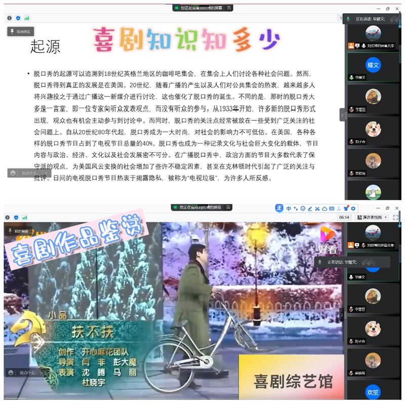 喜剧社线上活动以喜剧知识的介绍与喜剧作品的鉴赏为主,成员们在激情的讨论中深刻了解到了喜剧的内涵及其多样性,在欢声笑语中逐渐体悟喜剧艺术的传承与发展。活动不仅丰富了大家的线上学习生活,同时让大家紧绷的神经得以放松下来,对学习效率的提升也有很大帮助。