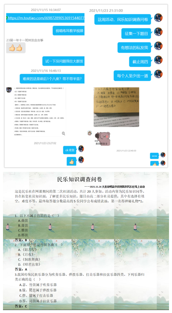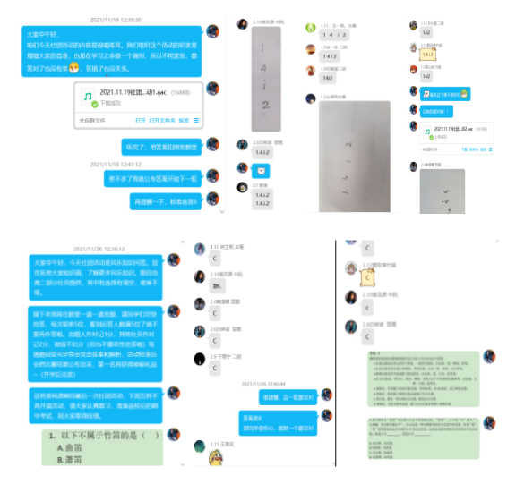 11月27日,民乐社在网课期间开展第二次社团活动,共计20人参加。活动内容为民乐知识问答。旨在拓宽社员知识面,了解更多民乐知识。题目由高二部分社员提供,其中有选择有填空,难度不等。最终取答题分数最高的5位同学公布成绩表扬,第一名得神秘礼物*1。