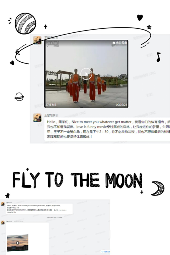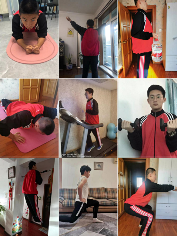 五育并举,统筹推进。在锻炼时,尽责的体委会定时发信息,提醒同学们锻炼,并将同学们上交的运动照片制作成视频,加以优美的配乐发到班级群内,得到了老师和同学们一致好评。在体委的帮助下,我们居家学习生活不再枯燥乏味,在丰富的课余生活中我们度过艰难的居家网课生活。