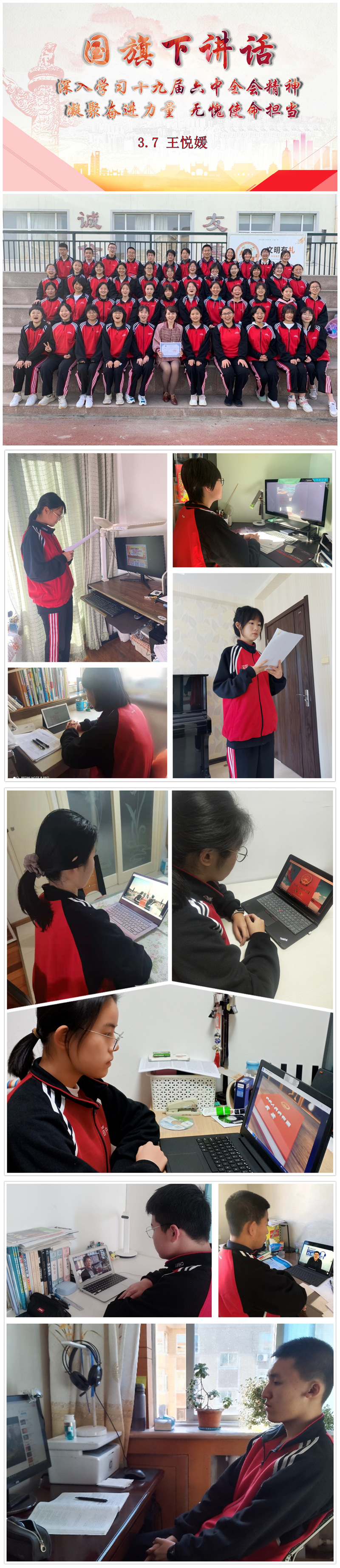 11月29日(星期一)早7点,我校团委组织全体师生在钉钉群举行线上升旗仪式,高三七班学生代表做“深入学习十九届六中全会精神,凝聚奋进力量,无愧使命担当”为主题的国旗下讲话。