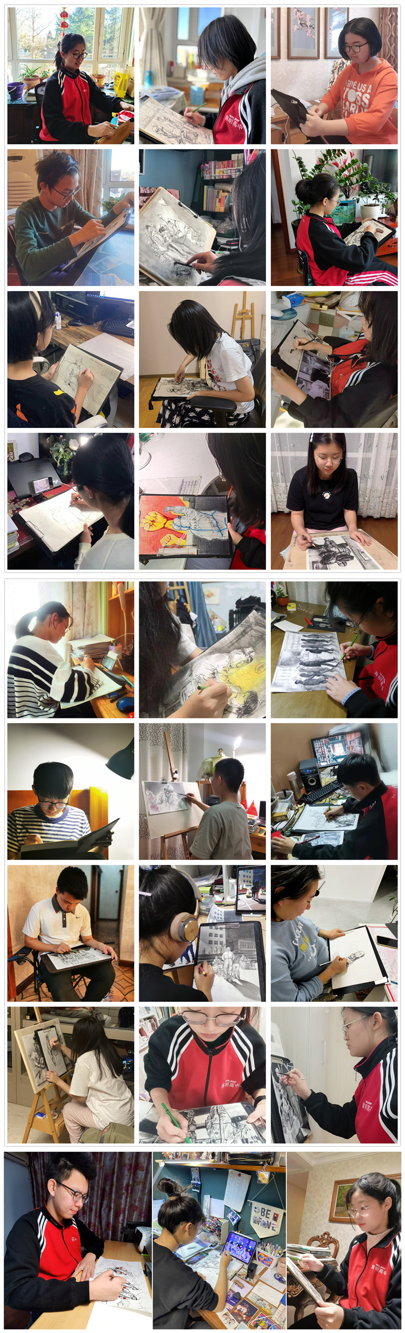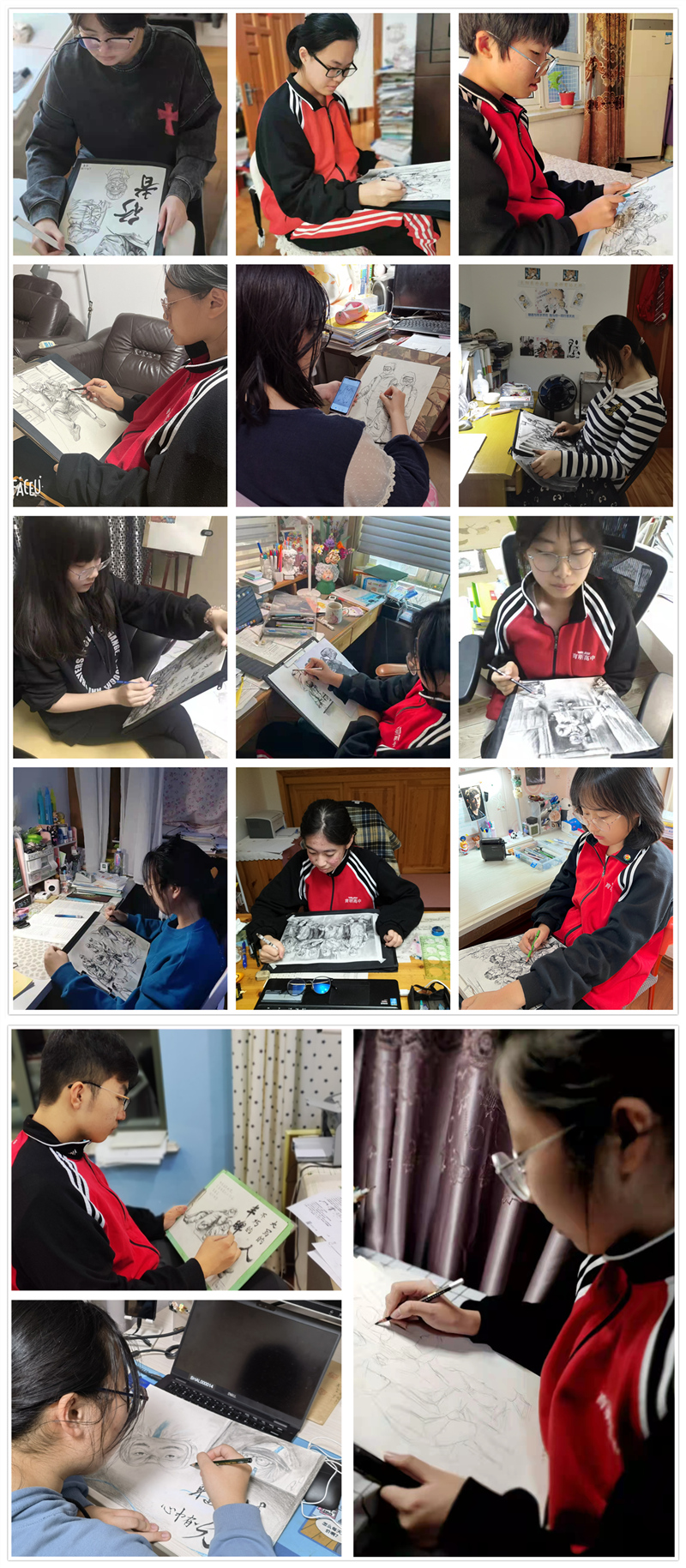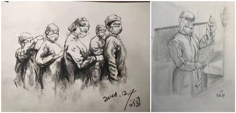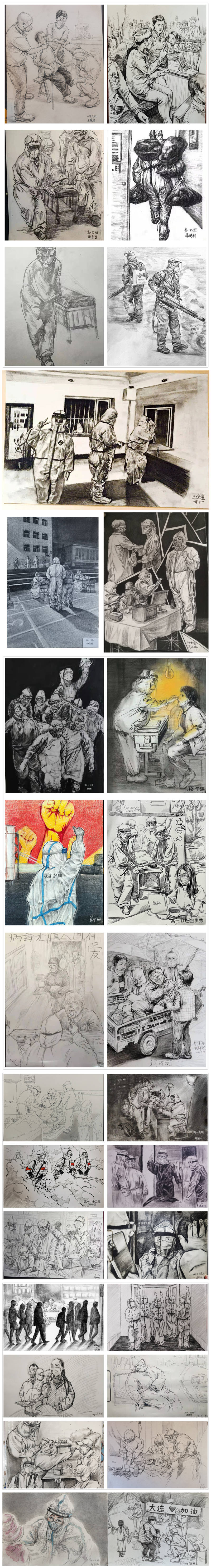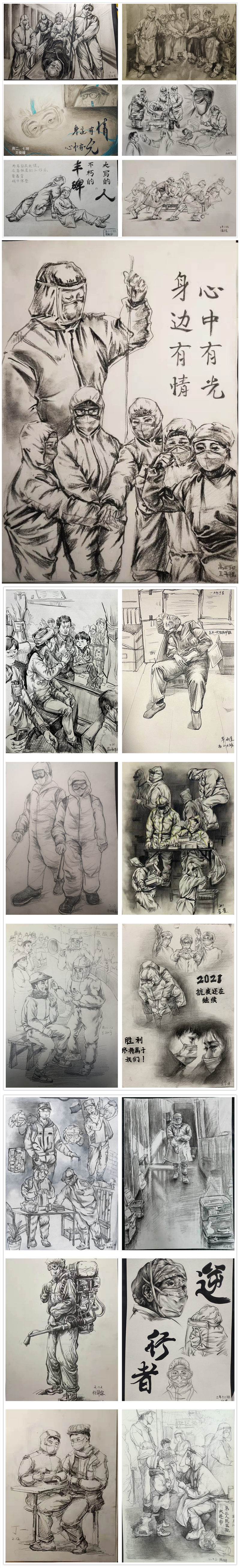 北风呼啸,雪花飘零,河流凝冰,一阵阵寒意扑面而来。2021年初冬,新冠疫情再一次毫无征兆地席卷大连……于是,同学们又开始了宅家生活。然而这并没有让育明美术生的生活变得灰暗,在美术李治宇老师和徐晶老师的倡议下,每天一幅速写作品给孩子们带来了精彩,同学们用手中的画笔画出了身边无数的感人故事:出征庄河的医护人员、核酸采样的“大白”、维持秩序的社区志愿者…他们为守护这座城日夜兼程。同学们虽然无法亲临现场,但可以用画笔记录下这感人的瞬间,“身边有情,心中有光”,绘出那些守护山河的战士的身影。时光荏苒,冰雪终将消融;四方温暖,星火重振枭雄,让我们携手共进“画”未来!
