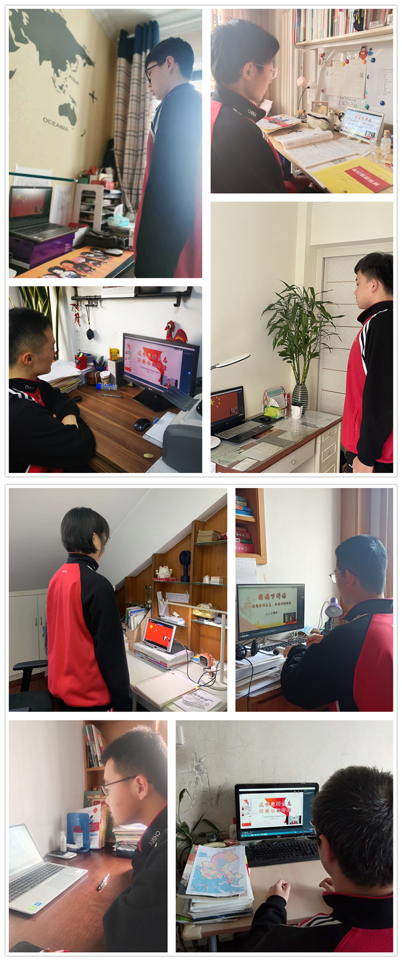哪怕只有屏幕中的肃穆,仍有心中鲜艳又深情的国旗;哪怕踏不遍祖国河山,脊梁笔挺,于国歌之下洗礼,也是我意气风发中国少年;纵有疫情关山难越,心怀信念,满腔热血,亦可拔丁抽楔!四海固穷,道心惟微,有我中华,屹而不倒。你我身遥心迩,天涯比邻,喷涌而出的就是那挥戈反日的中国力量!有着坚定且统一信念的我们,在居家学习的过程中,也一定会情有所寄,不肯浮泛,虚度光景!