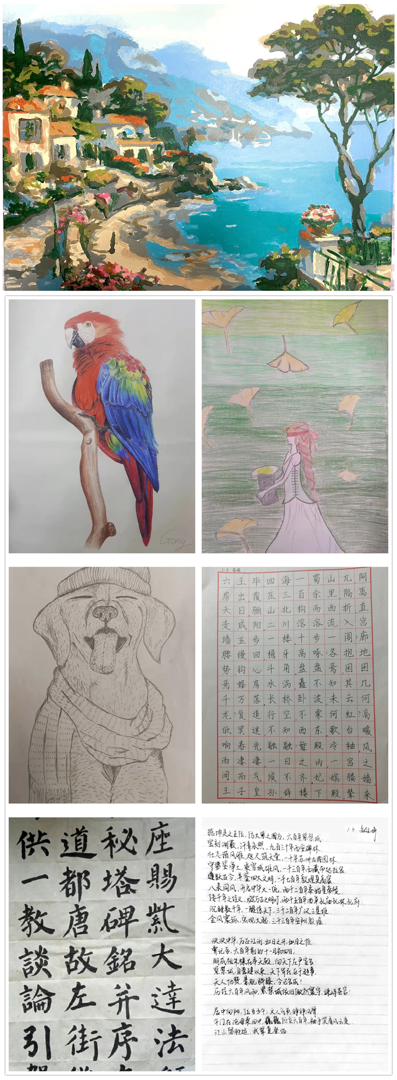 疫情当下,我们仍以饱满的艺术情怀展示出我们积极阳光的精神状态。网课期间,班级的每个同学都忙里偷闲,进行艺术创作。执起笔来,挥毫舞墨,翩若惊鸿,宛若游龙,疫情带来的阴霾便从心底一扫而空。画笔咏志,以聚千言万语;笔走龙蛇,可翻心中锦绣。这一幅幅艺术作品描绘着我们丰富的精神世界,萧然四壁,傲睨千古,此一境也。即便面对着疫情,只要我们追求艺术、热爱生活,那种种困难也就迎刃而解了。