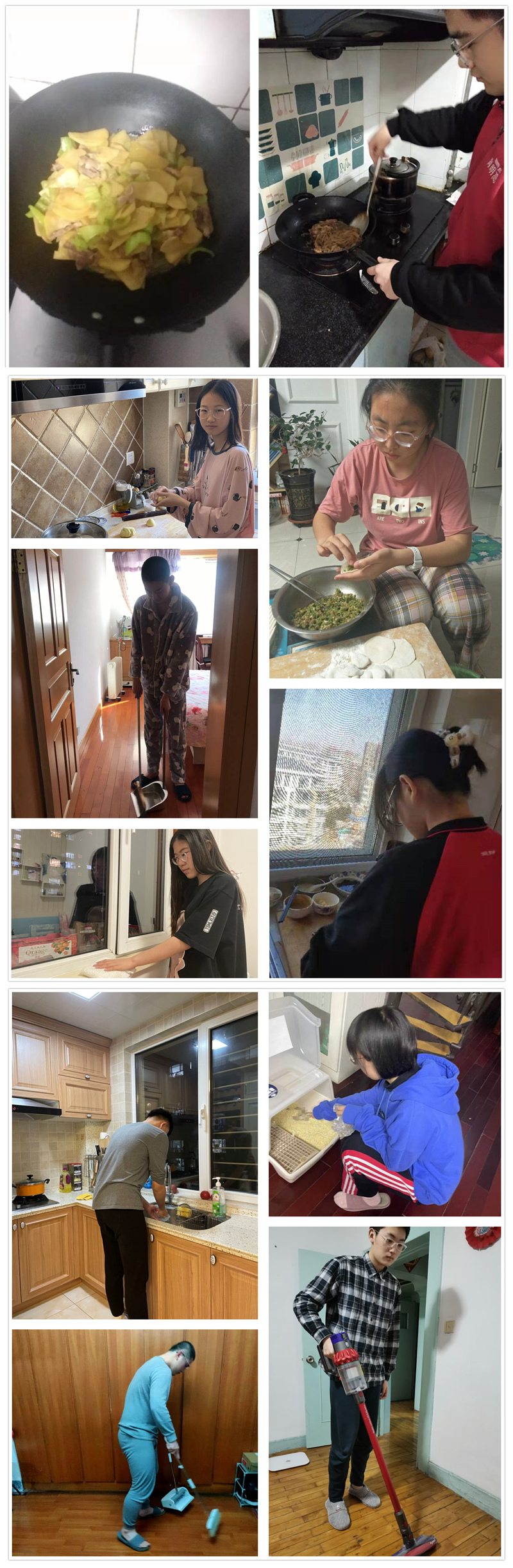 居家学习更是我们劳动的好机会。繁忙学习之余,拿起拖布,回归生活,享受着眼前的静好,看看窗外的远方,眺望着育明的方向。拭掉脸颊上的汗水,收获劳动的喜悦。回到案前,醍醐灌顶,效率不可谓不高!