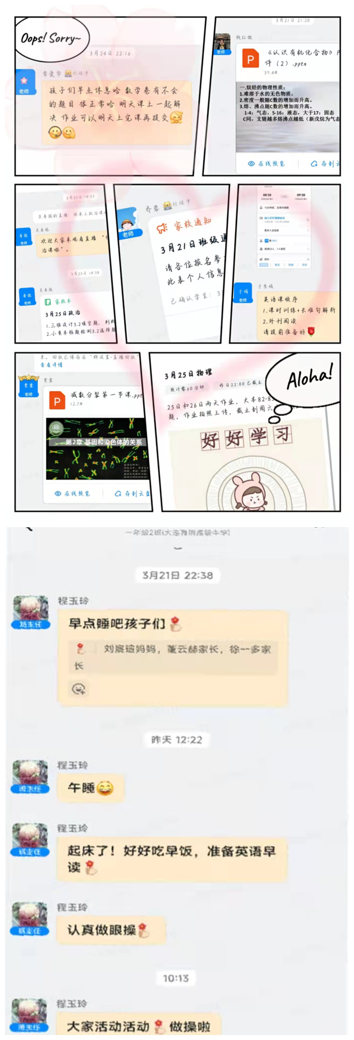 也许春天会迟到,但老师们的关爱却从不会迟到——春风化雨,新竹旧枝。每天早晨除了有冰冷的闹钟,更有程姐从不缺席的的“早读提醒”。在与数学顽强抗争的过程中,常老师的耐心和温暖也总会准时送达。为了能及时顺利的开启课堂,按时授课,保证同学们的接收效果,老师们更是“开辟”了各种各样的道路。在老师们的关心中,我们更加努力,更加认真,相信没有哪片乌云不会散去,没有哪场春天不会到来。
