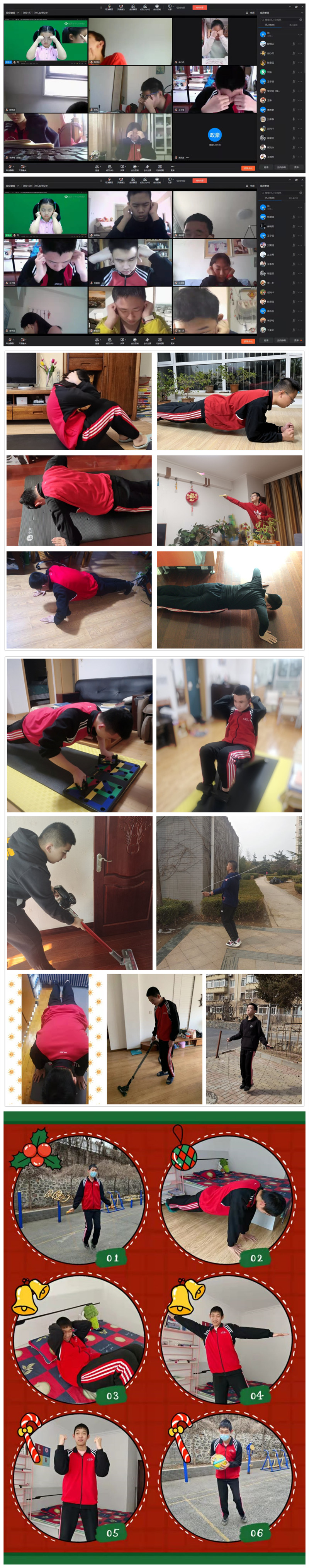 面对知识,我们勤学好问,好思善辩;面对生活,我们锐意进取,斗志昂扬。在卫生委员和体委每天按时的提醒下,同学们及时进行体育锻炼,认真做好眼保健操。学习不能落下,锻炼更不能懈怠。居家学习抵不过青年沸腾的热血,顶住压力,耐住寂寞,坚持运动,强身健体。