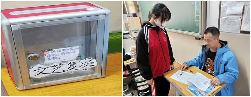 我们有一位和蔼可亲、善解人意的班主任——陈思老师。在课下,他就是我们的“大朋友”。我们学习上遇到什么困难、有什么心事,都可以向他倾诉。这是陈思老师设立的班级信箱,除了上述的内容之外,如果对班级建设有什么建议、意见,都可以写在纸上放进信箱里,老师会逐一回复。我们经常和老师分享生活中开心快乐的事,老师也会把他遇到的种种趣事告诉我们。我们很自豪,也很幸运,能够遇见这样的老师。