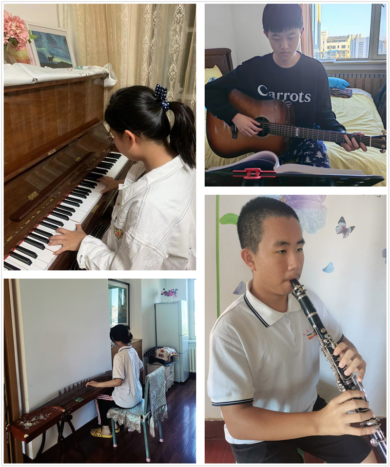 “且将新火试新茶,诗酒趁年华。”即使宅在家,同学们依然有诗意的生活。除了坚持每天的体育锻炼外,还注意培养个人特长,努力丰富课余生活,实现德智体美劳全面发展。音符律动间,同学们不仅发展了自己的兴趣爱好,收获了自信与快乐,缓解了居家的学习压力的同时,提高了学习效率。