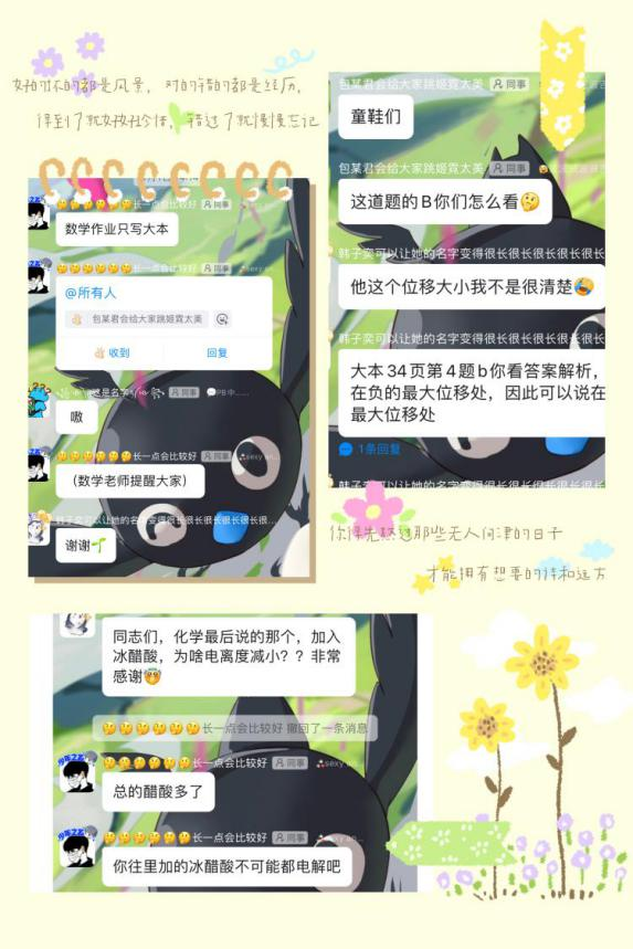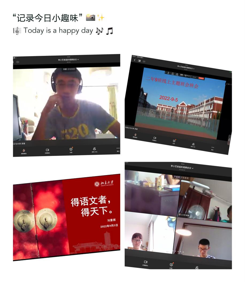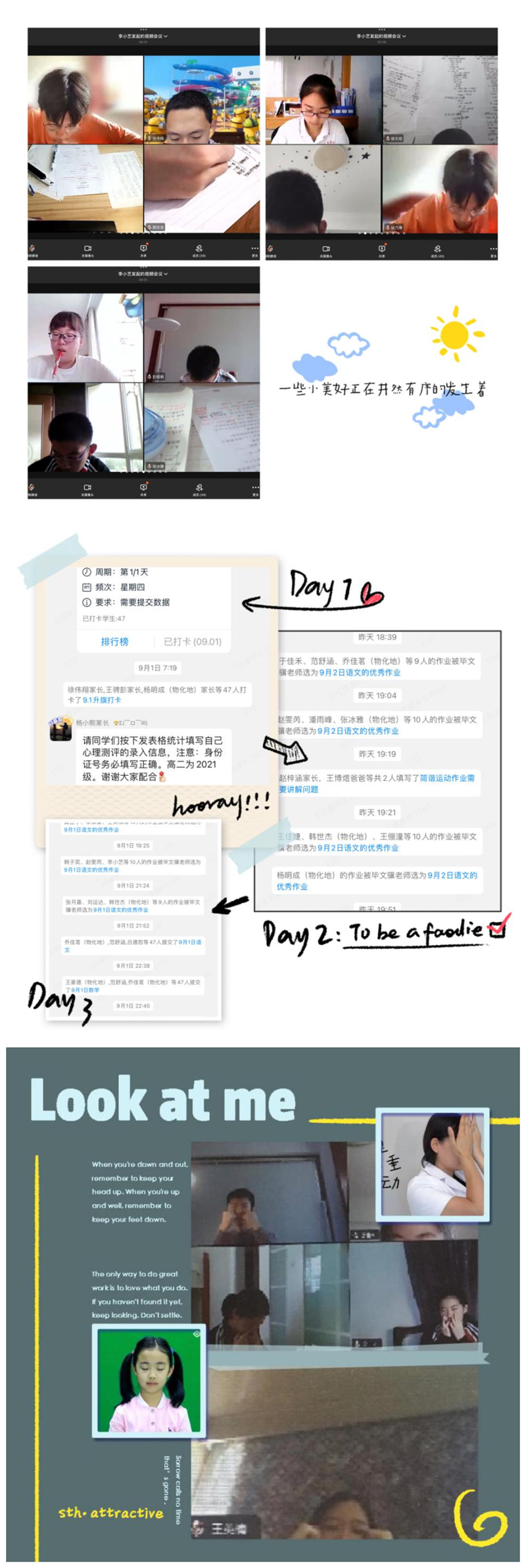 在班主任刘懿老师带领下,九班成立了以小组为单位的线上学习模式,建立了小组群,方便同学们讨论问题。班级干部各司其职,共同帮扶,保障了同学们线上学习的顺利、高效。严格按照学校要求,自习课班主任、班干部全程监管,按时统计各课出勤情况,并记录学习时长。及时反馈给家长,将“他律”作用最大化。