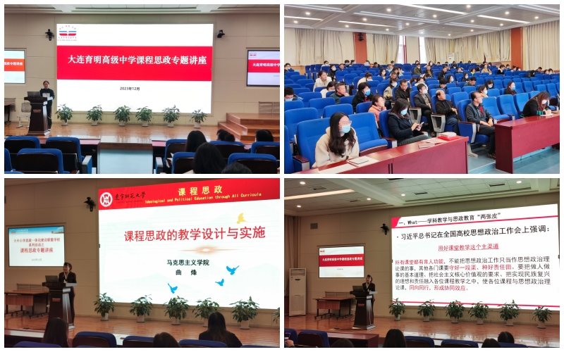 | 为深入贯彻习近平新时代中国特色社会主义思想和党的二十大精神及习近平总书记在学校思想政治理论课教师座谈会上的重要讲话精神,全面落实国务院办公厅《关于深化新时代学校思想政治理论课改革创新的若干意见》文件要求,推进我校“大中小学思想政治教育一体化建设实践基地校、联盟校”工作,使各类课程与思政课同向同行、形成思政工作协同格局,2023年12月7日,我校特邀辽宁师范大学曲烽教授为全体教师做了一场精彩的课程思政专题讲座。