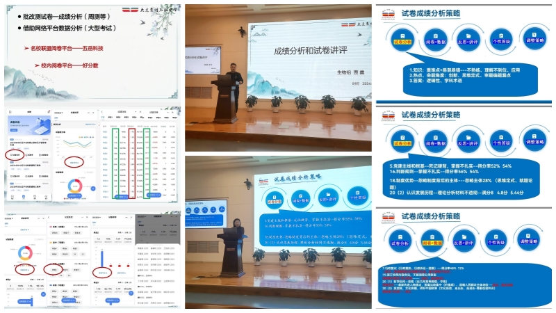 接着,生物组贾震老师和政治组奚科研老师分享了他们的试卷讲评和辅导经验。贾震老师做了关于高三二轮复习期间考试的成绩分析和试卷讲评的报告。他着重讲解了如何利用线上平台和数据手机端工具对本班成绩进行分析及横纵向比较,找到教学中出现的问题并及时解决。通过对2022和2023年高考真题的分析,他指出,科学备考需要依据最新的高考政策、考试形式和题型变化,合理安排复习内容和进度,确保学生能够全面覆盖考试要点。奚科研老师结合本次大连市三校联考的政治试卷和成绩,为大家梳理了考后分析讲评策略。奚老师坚持“以生为本、问题导向”的备考理念,从试卷答题情况预判、阅卷及成绩数据分析、指导学生自主问诊、讲评课上师生深度研讨、一生一策个性化指导及备考策略动态调整等方面做了全面深刻的解读,为高三各备课组后期的备考工作提供了行之有效的“路线图”和“方法论”。