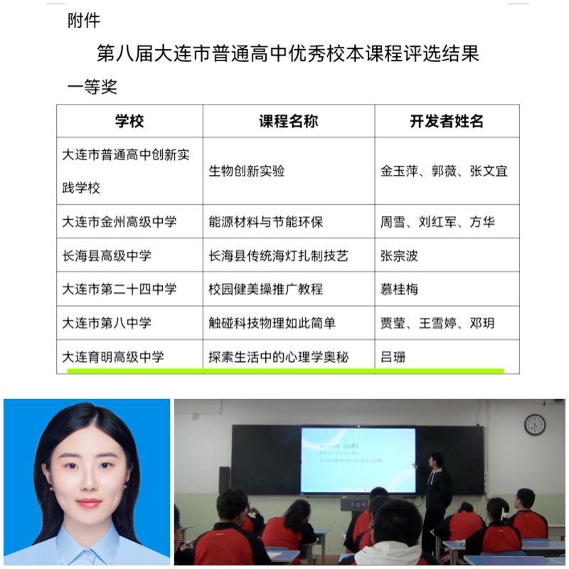 | 为深化普通高中课程改革,加强高中校本课程建设,大连市教育局组织开展了第八届大连市普通高中优秀校本课程评选活动,我校积极响应市教育局号召,致力于丰富学校课程资源,完善学校特色课程体系,满足学生全面、个性发展的需求。近日,评选活动结果揭晓,我校心理教师吕珊开发的校本课程《探索生活中的心理学奥秘》获评一等奖,特此祝贺!